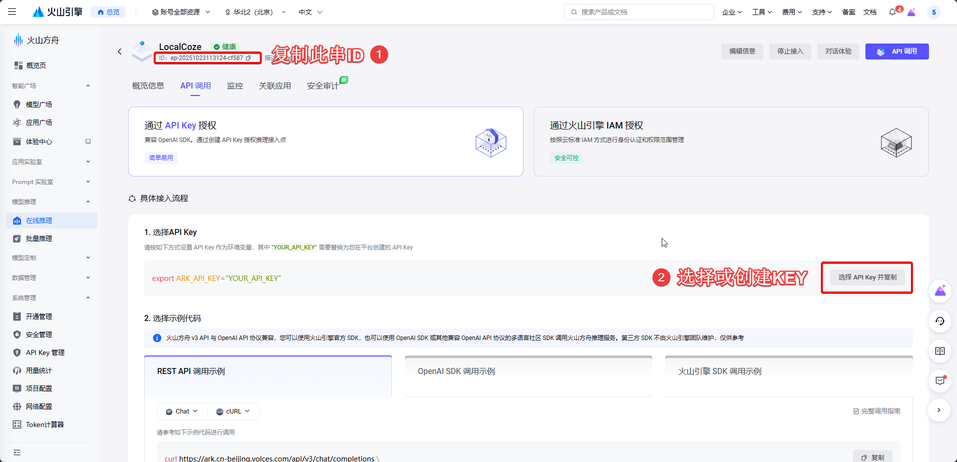 1.登录火山引擎控制台,进入火山方舟 → API Key 管理创建 API Key。
