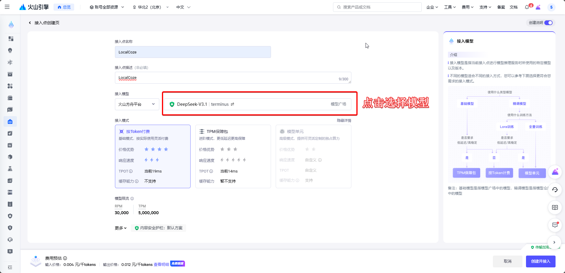 2.在在线推理页面创建自定义推理接入点,选择目标模型(如DeepSeek-V3.1),获取 Endpoint ID。