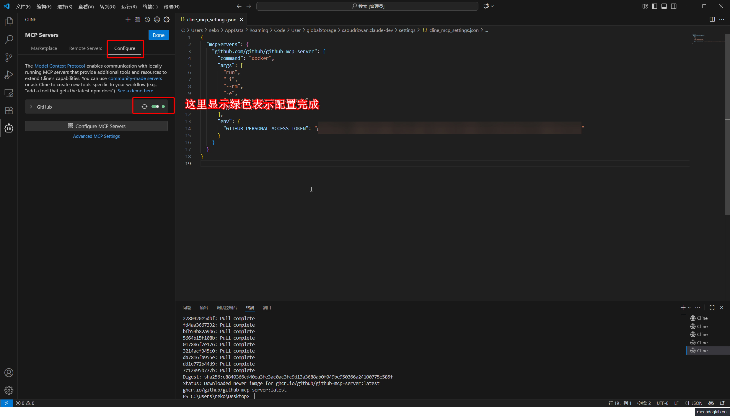 MCP服务器是扩展Cline能力的关键,它让Cline能够调用外部工具(这里是GitHub的API)。