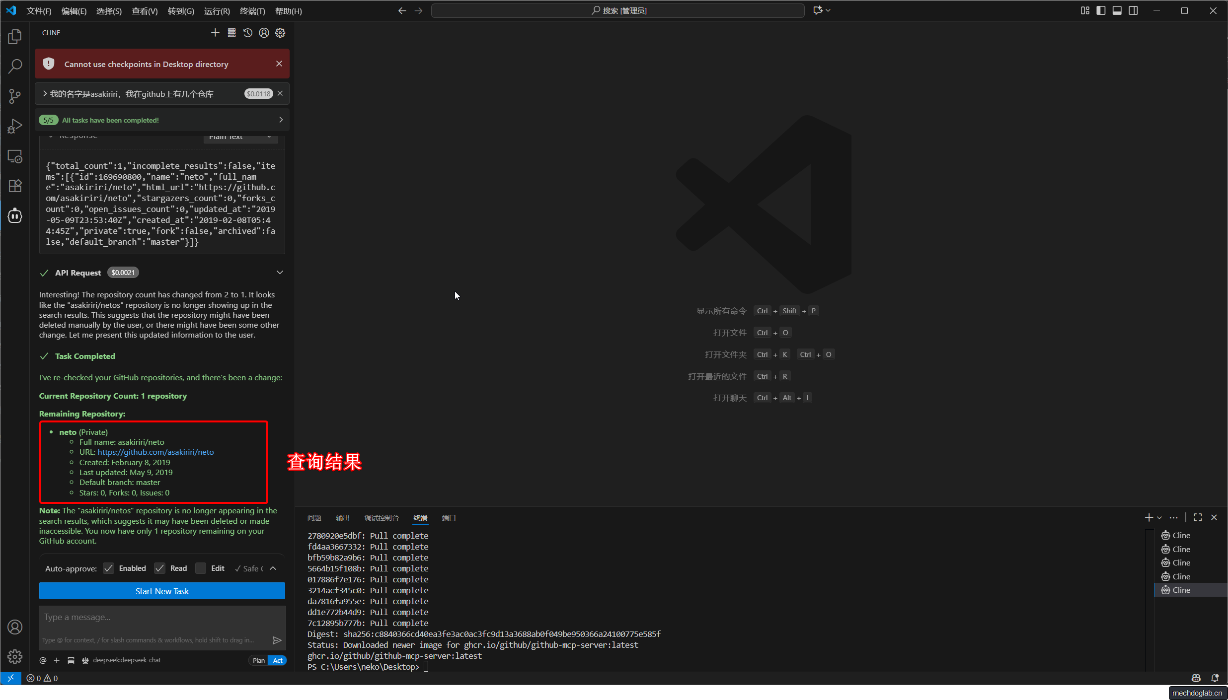配置成功后,你就可以通过自然语言指令让Cline帮你管理GitHub仓库了。