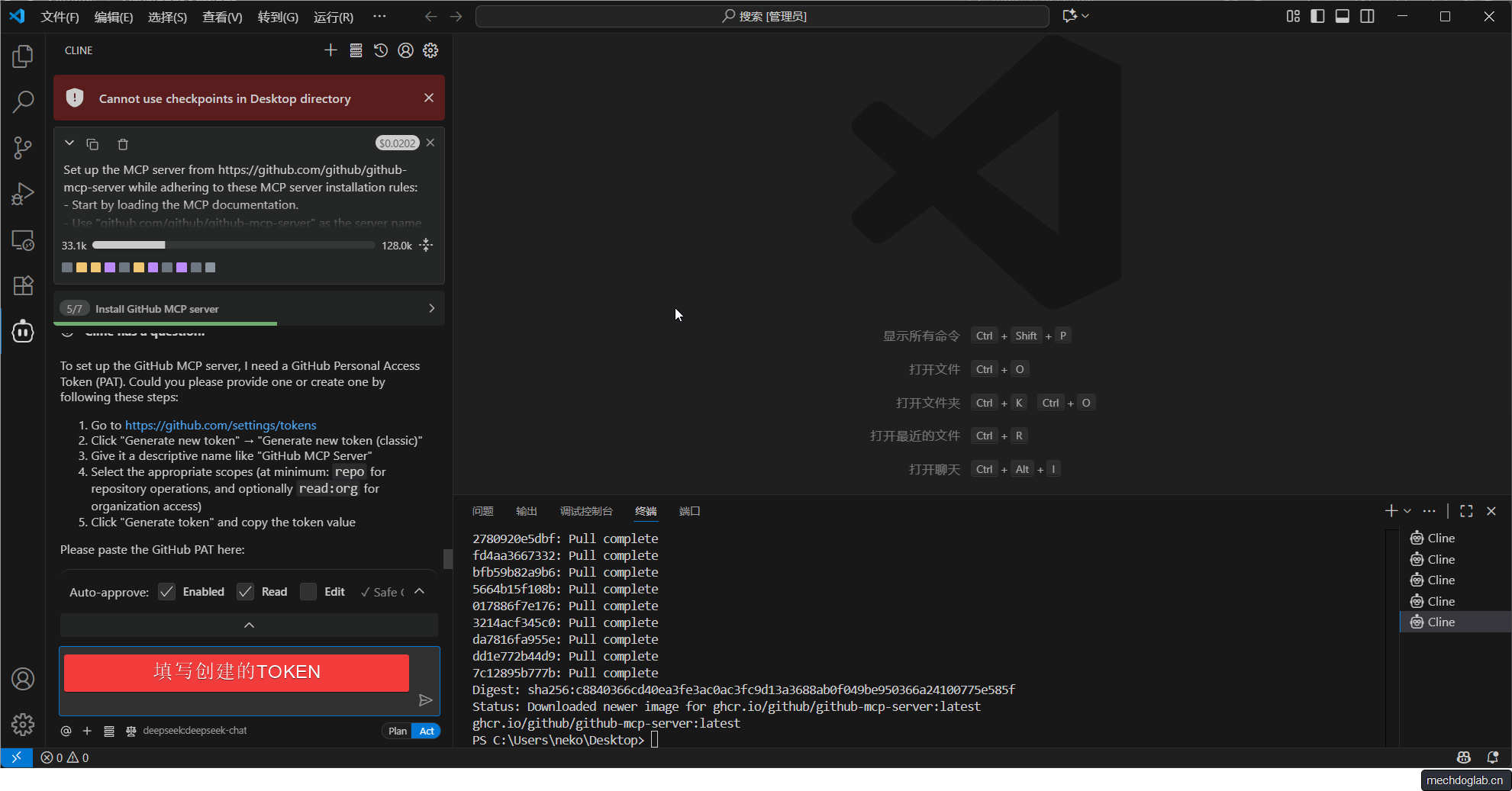 - 回到Cline的对话界面,AI会引导你输入刚刚创建的GitHub令牌。将复制的令牌粘贴到聊天窗口中,Cline会自动将其填充到生成的MCP服务器配置文件(如