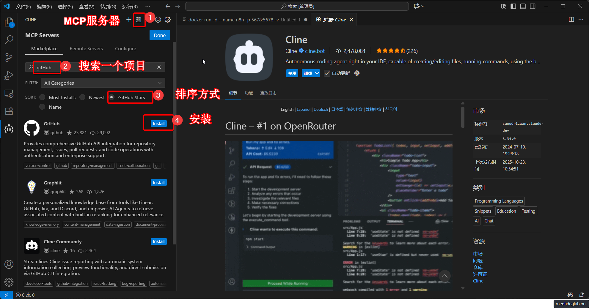 在Cline的界面中,找到并点击进入“MCP Servers”市场。 - 安装GitHub MCP服务器