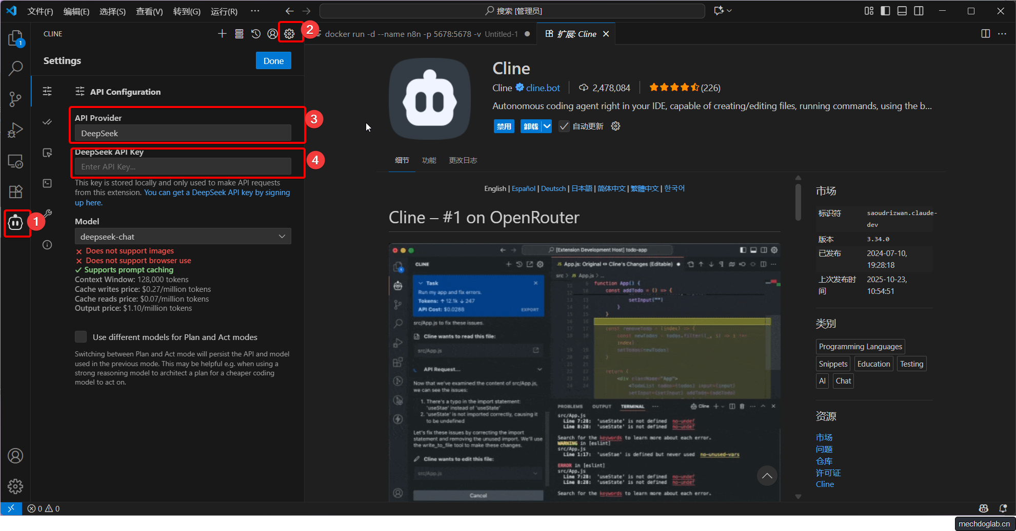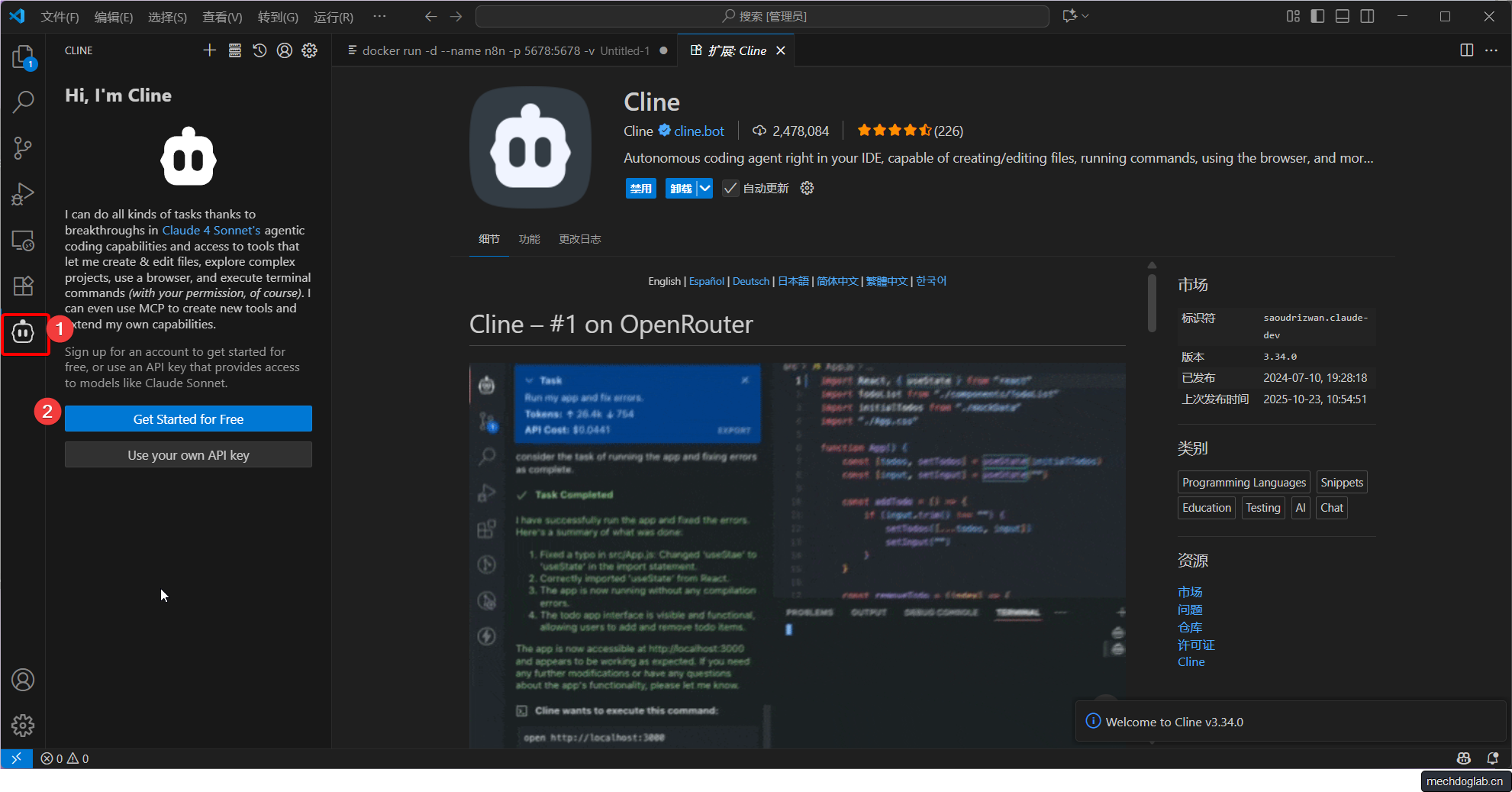 在VSCode中打开扩展市场(Ctrl+Shift+X),搜索“Cline”并安装。安装完成后,VSCode左侧活动栏会出现一个机器人图标。