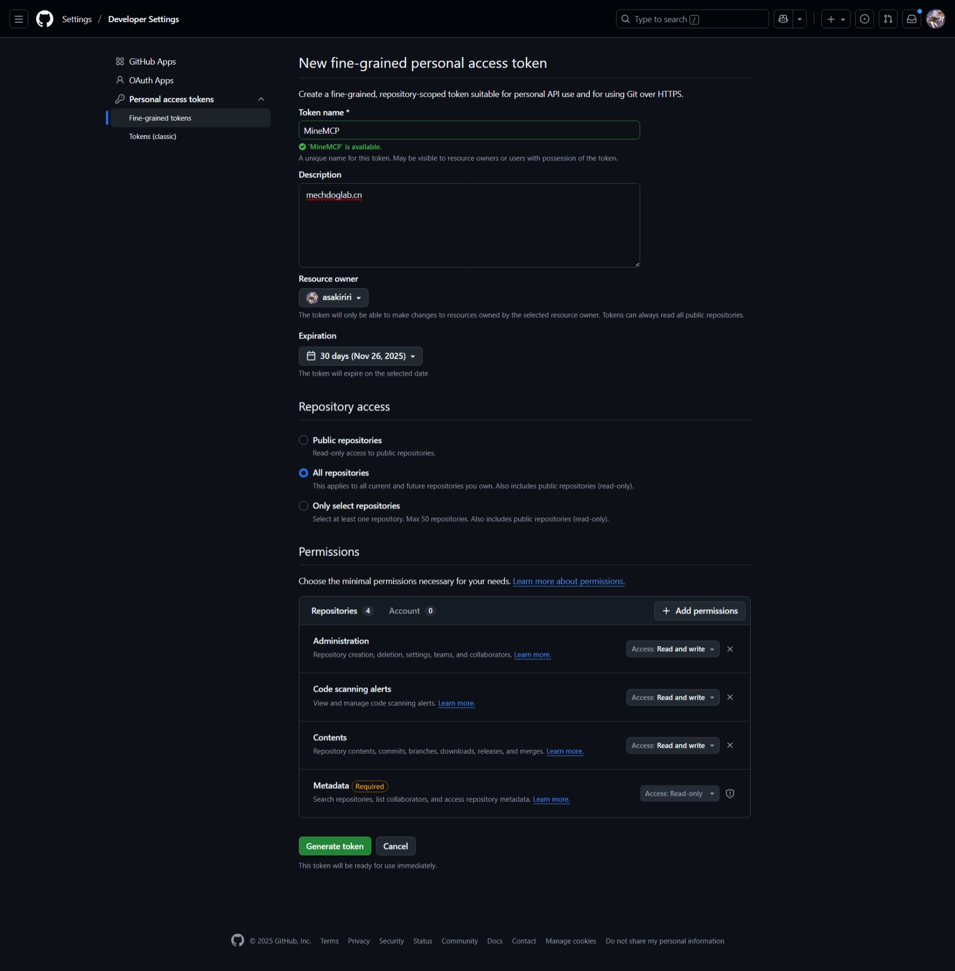 - 为令牌设置一个描述性的名称(如